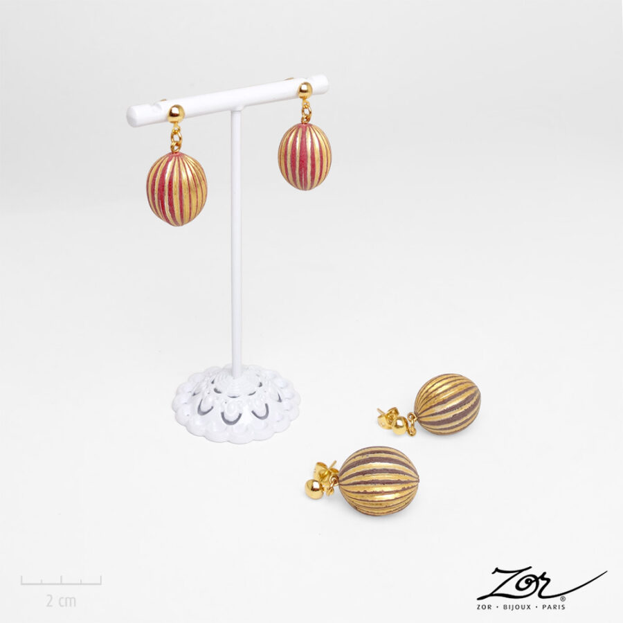 Bijouterie & Douceur de vivre. Les Boucles d’oreilles « Lampion vintage » enchantent par leur singularité. La perle ovale, présente des cannelures verticales qui captent la lumière de façon subtile. Elles existent en deux teintes exquises: un rose « brique clair » rétro ou un taupe intemporel. Les arêtes en relief, dorées mat, irrégulières et poudrées, confèrent une authenticité artisanale et une douceur visuelle captivante.